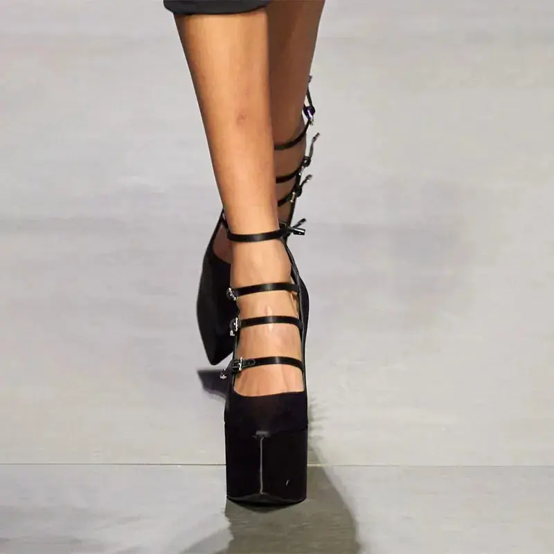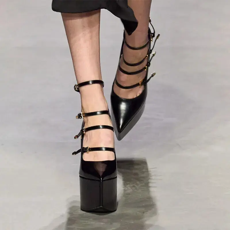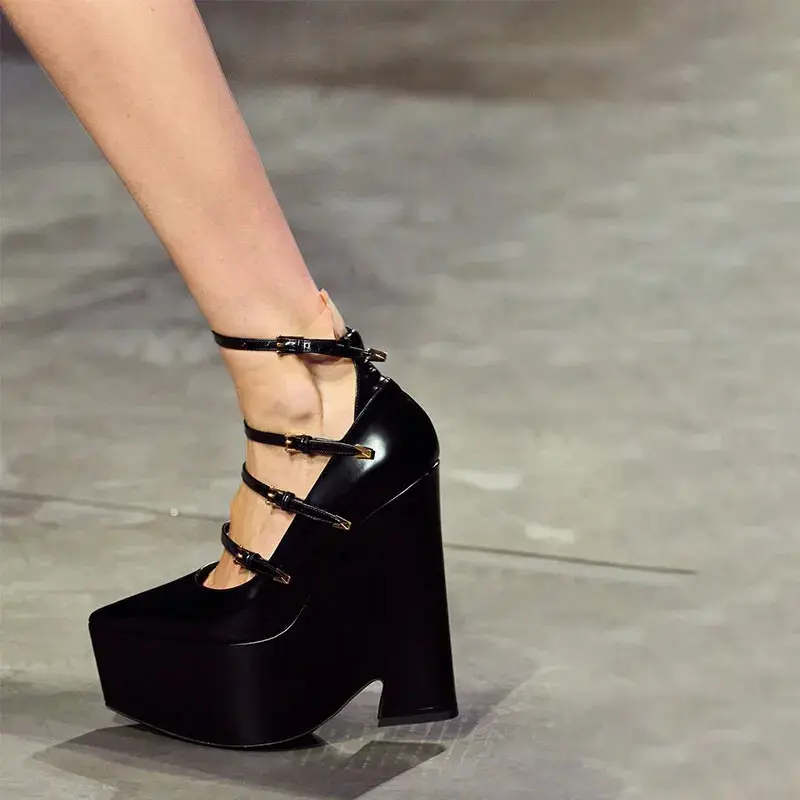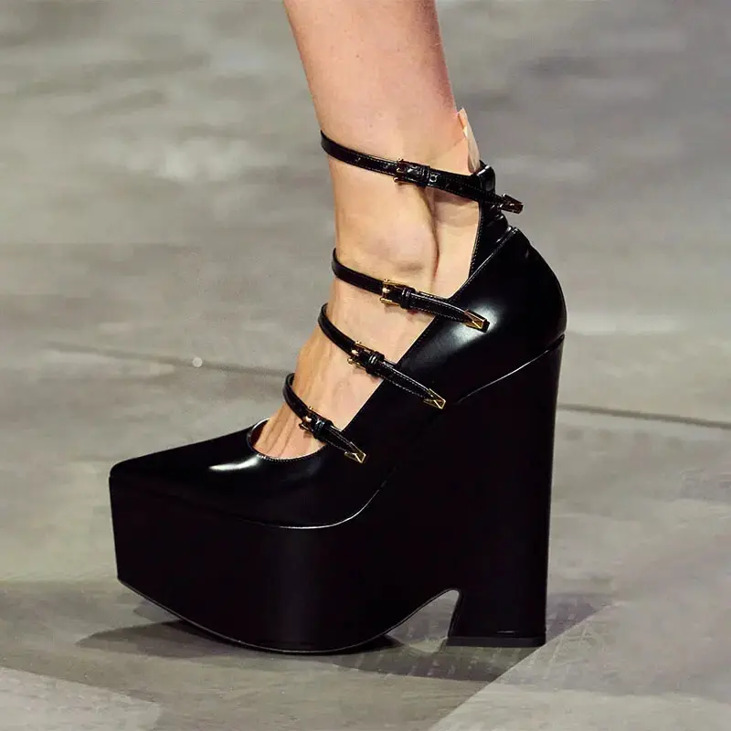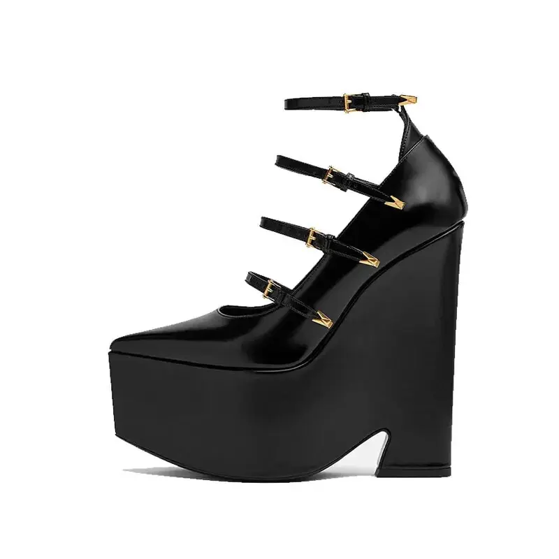 Black Platform Wedge Heels Strappy Pointed Toe Super High Microfiber Evening