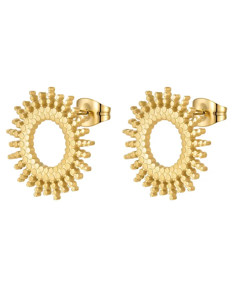 Tags: gold sunburst stud earrings for women, hypoallergenic gold stud earrings, modern design gold earrings, lightweight daily wear gold studs, contemporary stainless steel earrings gold finish, polished gold sun earrings, unique sunburst stud earrings, comfortable gold earrings for all day wear, small gold stud earrings everyday, elegant gold stud earrings for work, chic gold stud earrings for nights out, minimalist gold sunburst jewelry, radiant finish gold stud earrings