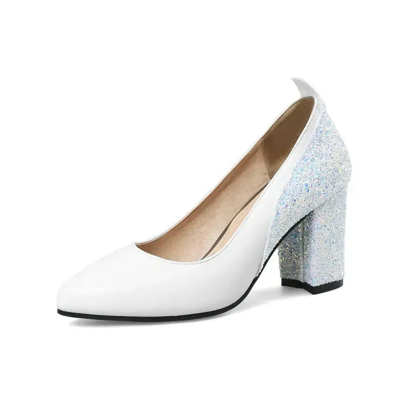 Glitter PU Point Toe Chunky Block Heels - High Heel Pumps With Bling