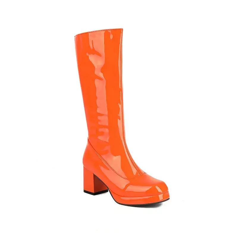 Green Orange PU Leather Gothic Square Toe Chunky Heel Boots