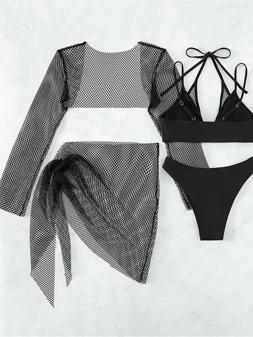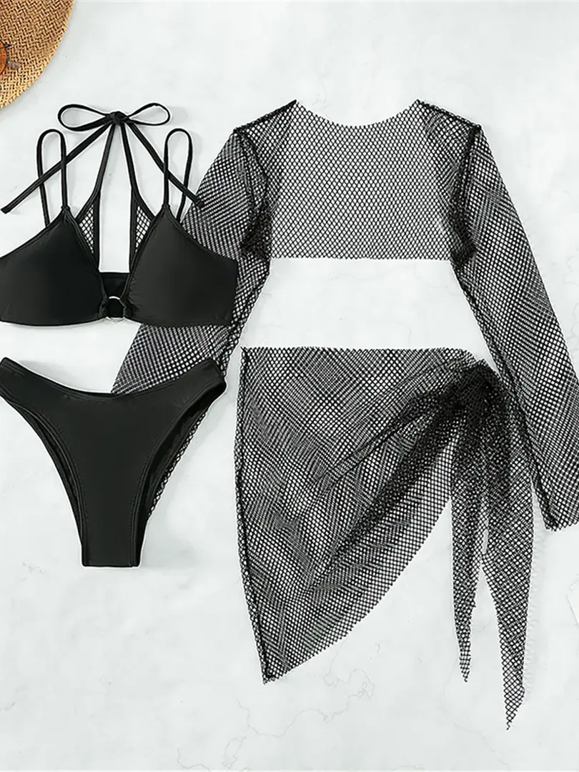 Halter Bikini Swimsuit Long Sleeve Sarong Cover Up Beachwear