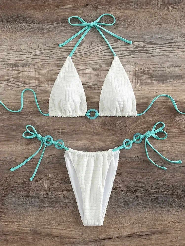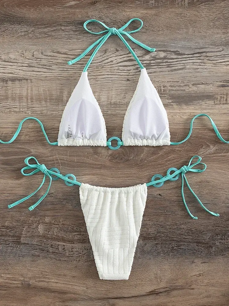 Make a splash in this Halter Bikini Swimwear featuring a splicing ribbed design. The two-piece swimsuit offers a stylish blend of textures and colors for a flattering fit and modern look.