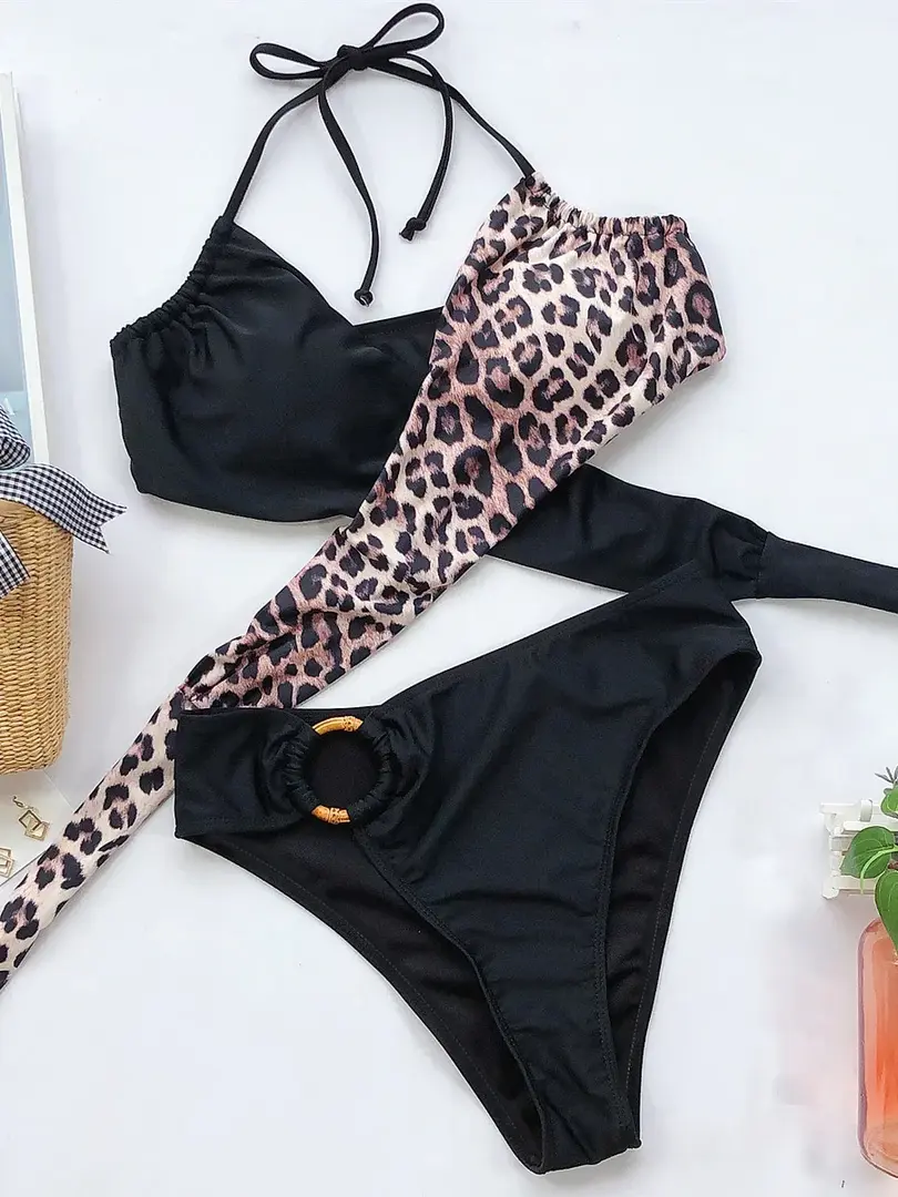 Halter Leopard Print Bikini Swimsuit Two Piece Bathing Suit