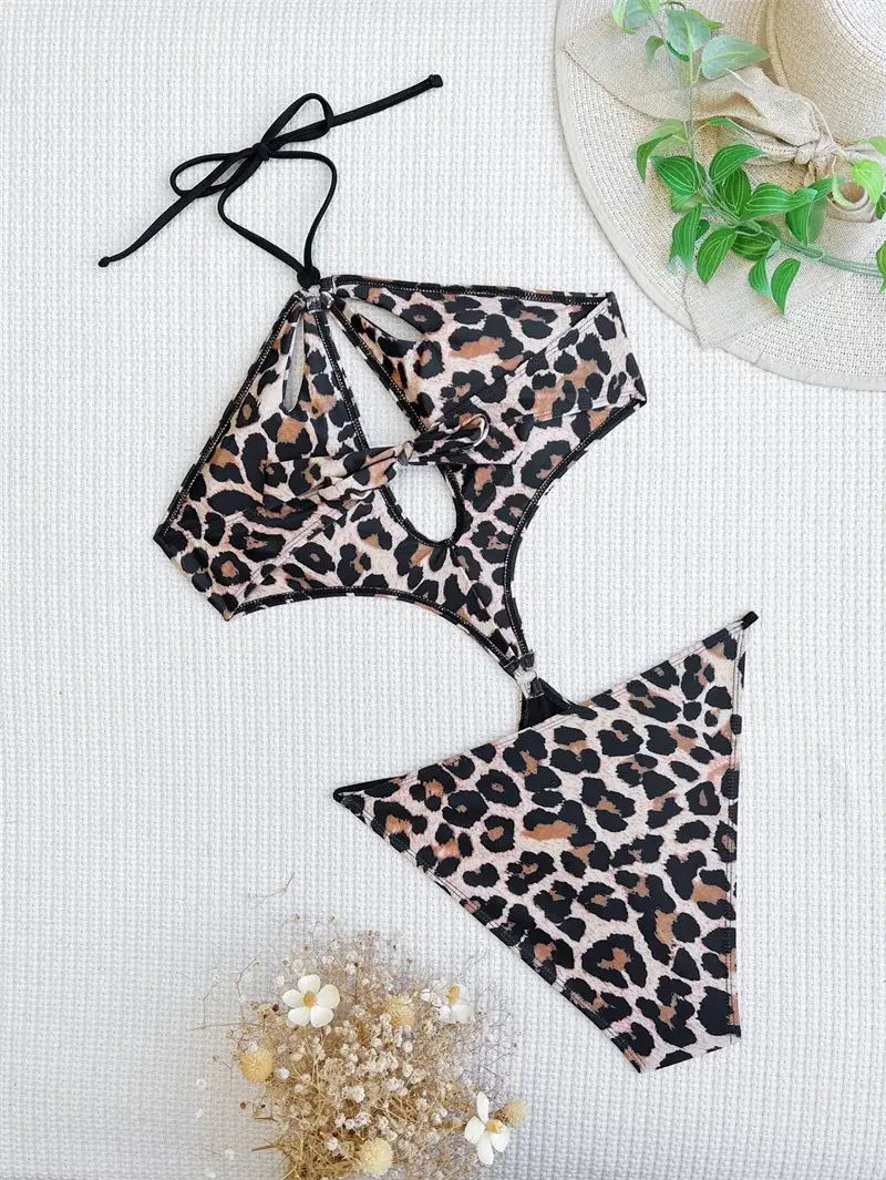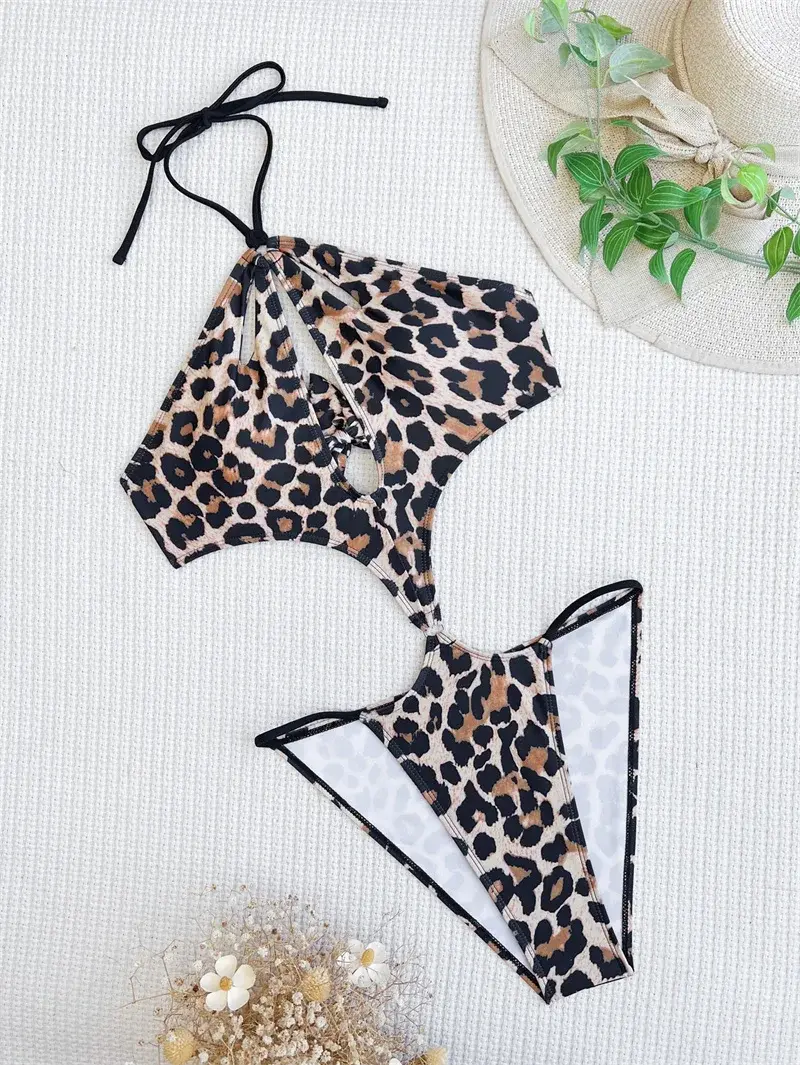 Halter Leopard Print One Piece Swimsuit - Bathing Suit