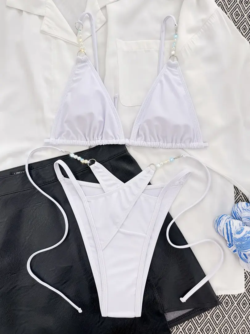 Halter Pearl Bikini Set High Cut Swimsuit Two Piece Bathing Suit