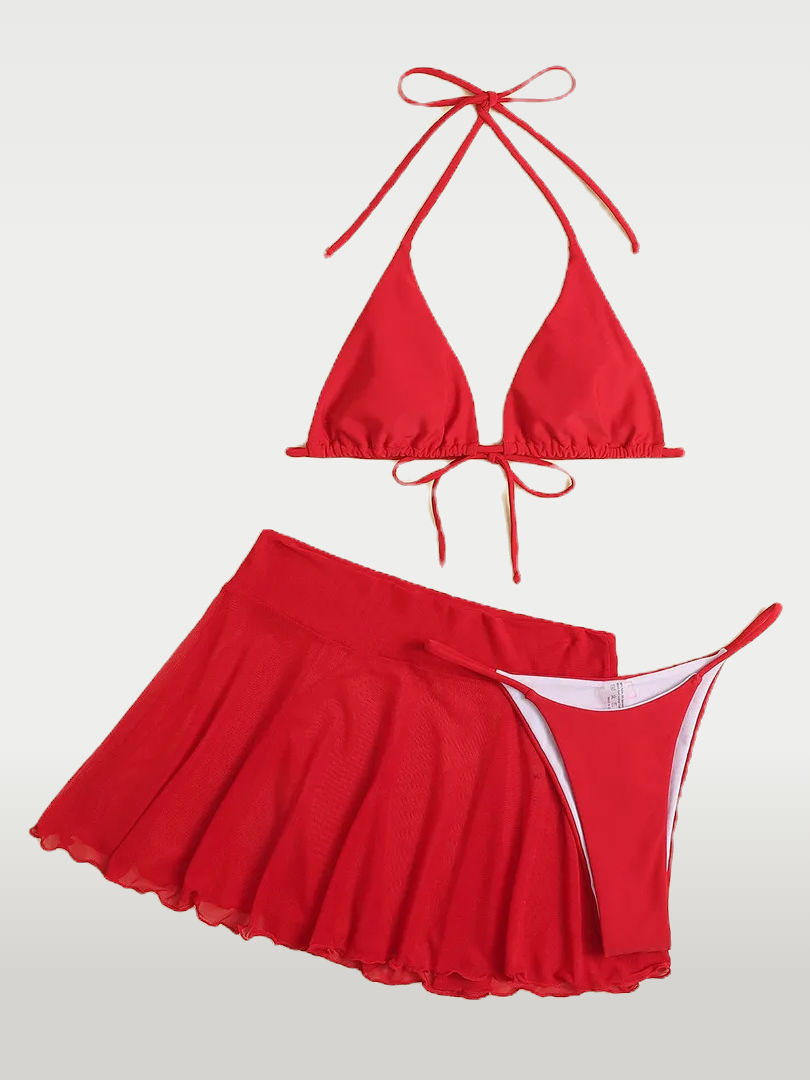 Halter Red Bikini Swimsuit Three Piece Set Beachwear Bathing Suit