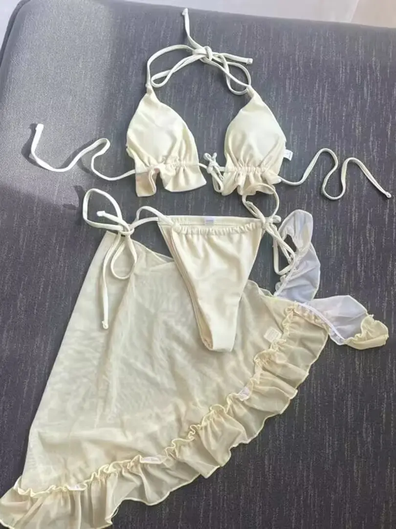 Halter Ruffled Bikini Swimsuit Sarong Three Piece Set Beachwear