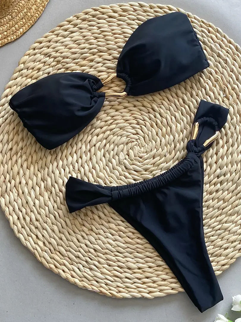 High Cut Metal Rings Bandeau Bikini Swimsuit Two Piece