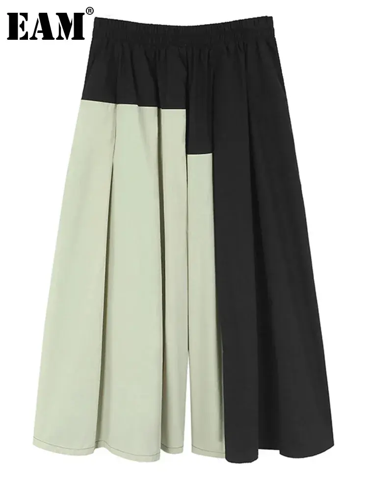 High Elastic Waist Black Color-Block Pleated Long Wide Leg Pants New Trou