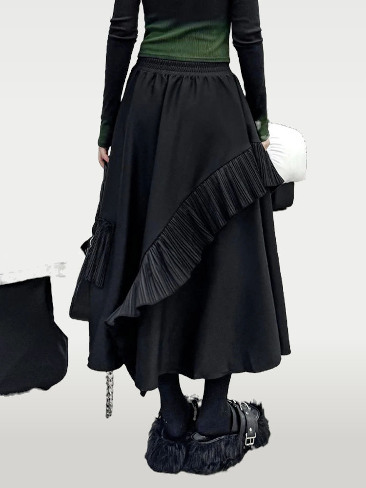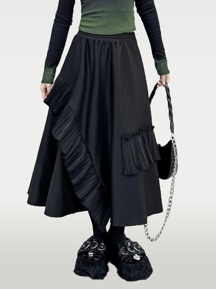 High Elastic Waist Black Irregular Pleated A-Line Half-Body Casual Skirt W