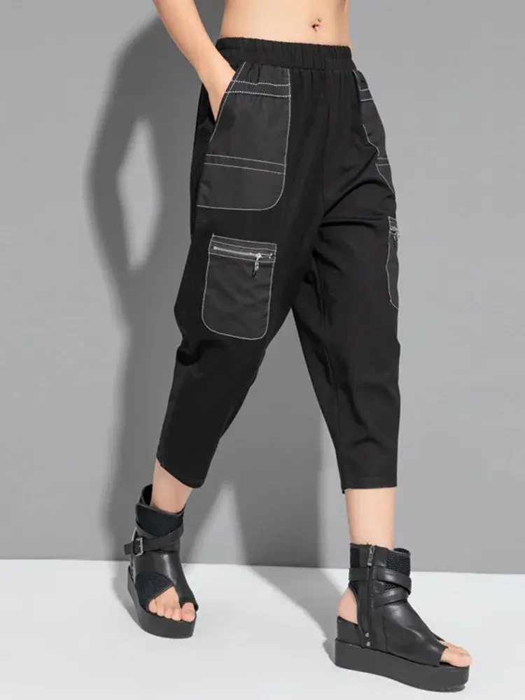 High Elastic Waist Black Pockets Casual Harem Pants New Loose Fit Trousers Wome