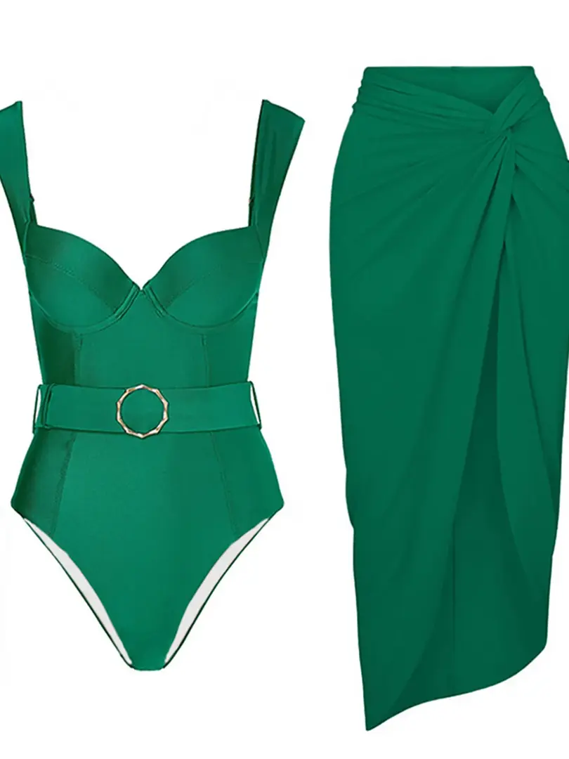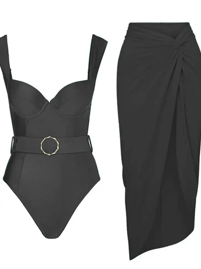 High Leg Cut Swimsuit One Piece Bathing Suit With Belt Skirt Underwire