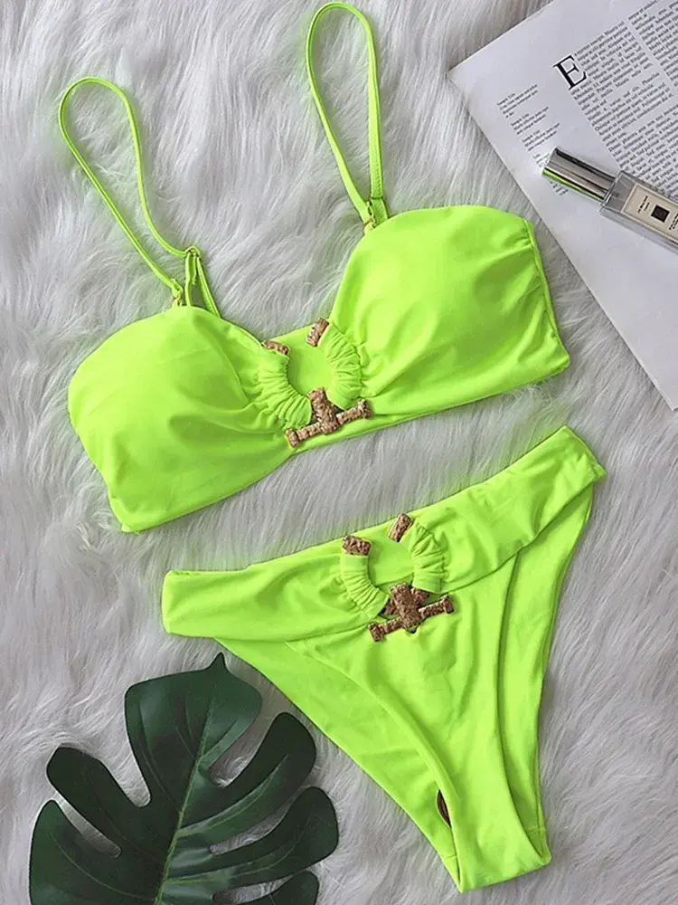 Embrace the sun and surf in this comfortable and stylish bikini set. Designed for a flattering fit, this set features a high waist bottom and supportive, wire-free cups. The soft and stretchy fabric ensures a comfortable wear, while the solid color provides a timeless and versatile look.
