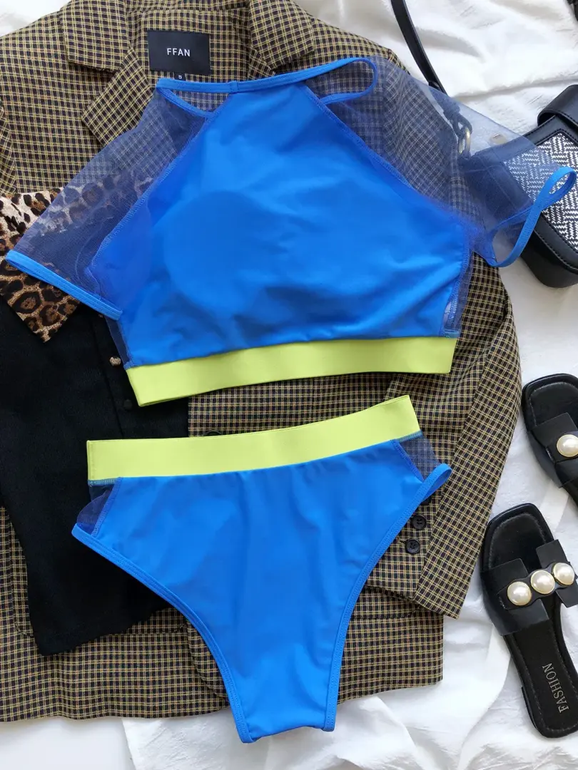 High Waist Mesh Splicing Bikini Swimsuit Short Sleeve Swimwear