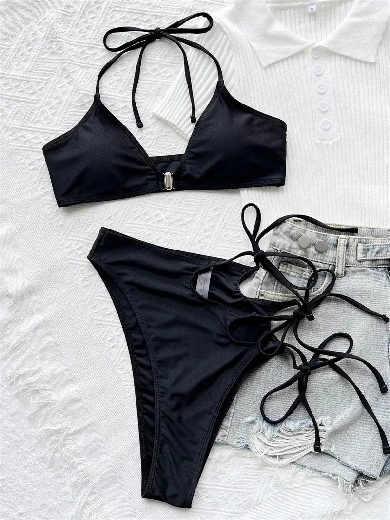 - Make a bold statement with this edgy high-waist bikini. Featuring a unique asymmetric cut-out and strappy design, it offers a flattering and modern look. Perfect for pool parties or beach days.
