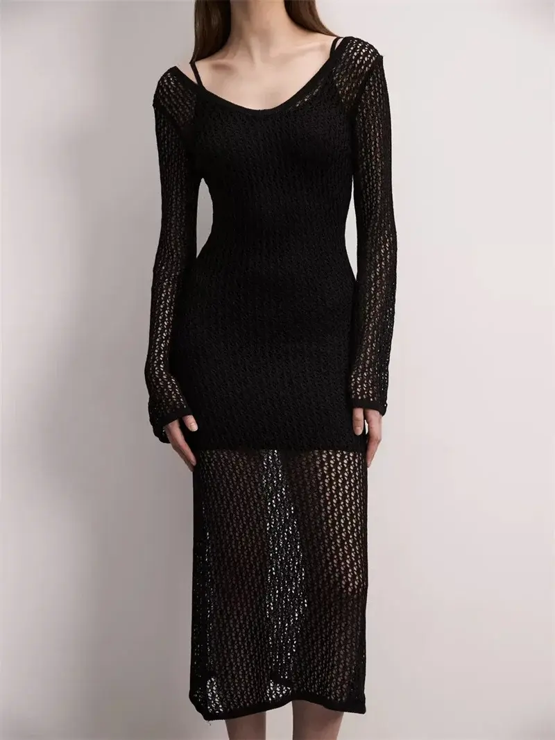 Hollow Out Knit Beach Dress Long Sleeve Cover Up Bathing Suit