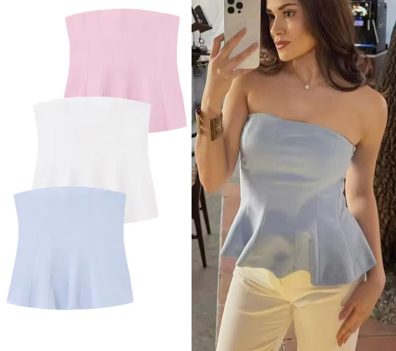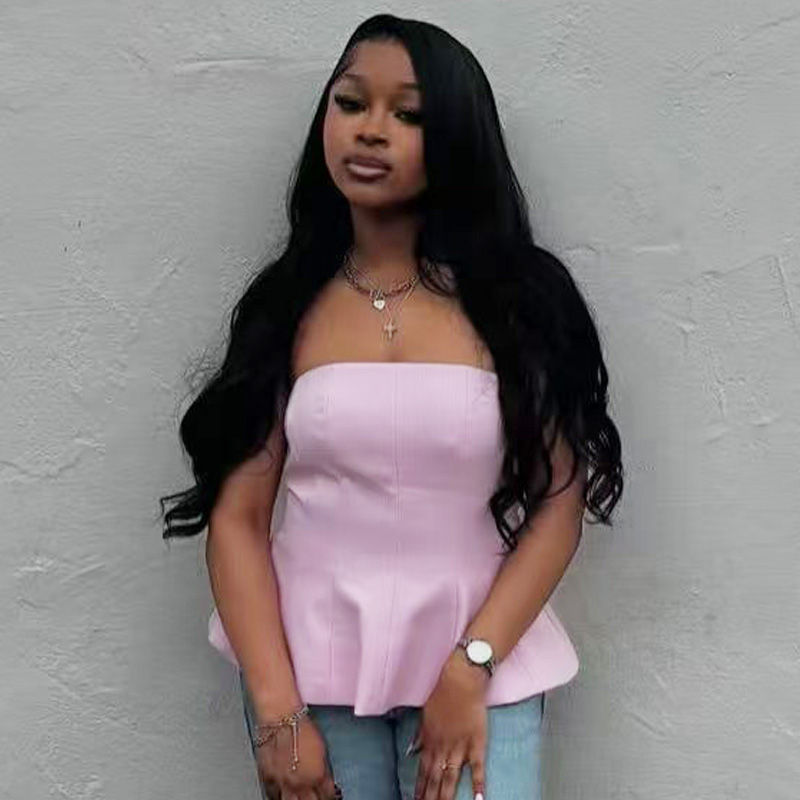 Tags: strapless ruffled corset top for women, pink corset top outfit ideas, white strapless bustier top, blue ruffle trim corset top, high street style corset tank top, non stretch solid color corset top, spring summer going out top, women's corset top with ruffles, how to style a strapless corset top, corset top for wide leg pants, casual corset top for summer, structured ruffle tank top, strapless top with ruffle hem, solid color strapless bustier
