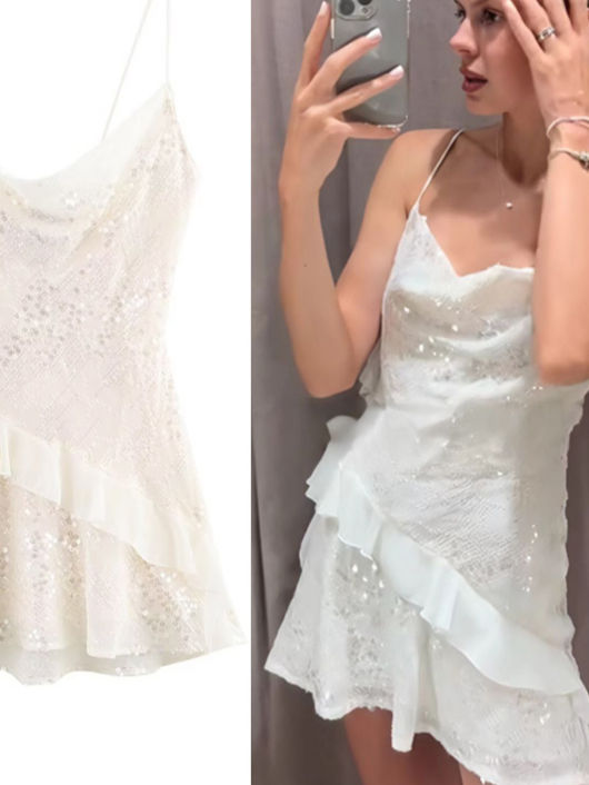 Layered Sequin Slip Dress, Swinging Collar Mini Dress, White Ruffled Pleated