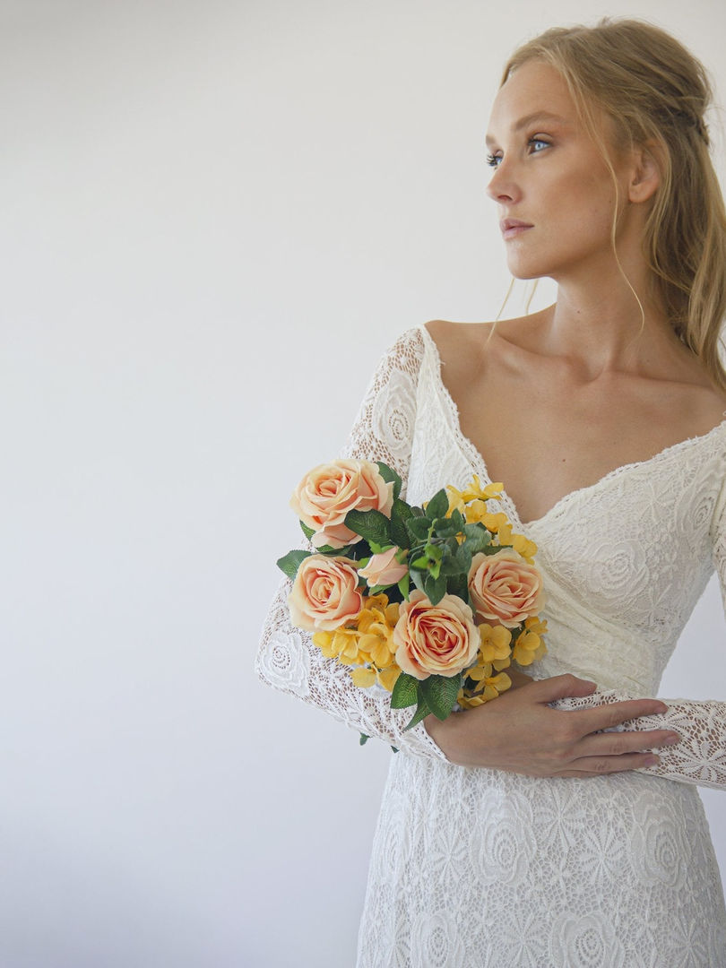 This floor-length dress features a lightweight floral lace design, perfect for creating a memorable look. It's handmade, with long lace sleeves and a flattering wrap off-the-shoulder neckline. The skirt combines lace and chiffon mesh for a beautiful flow.