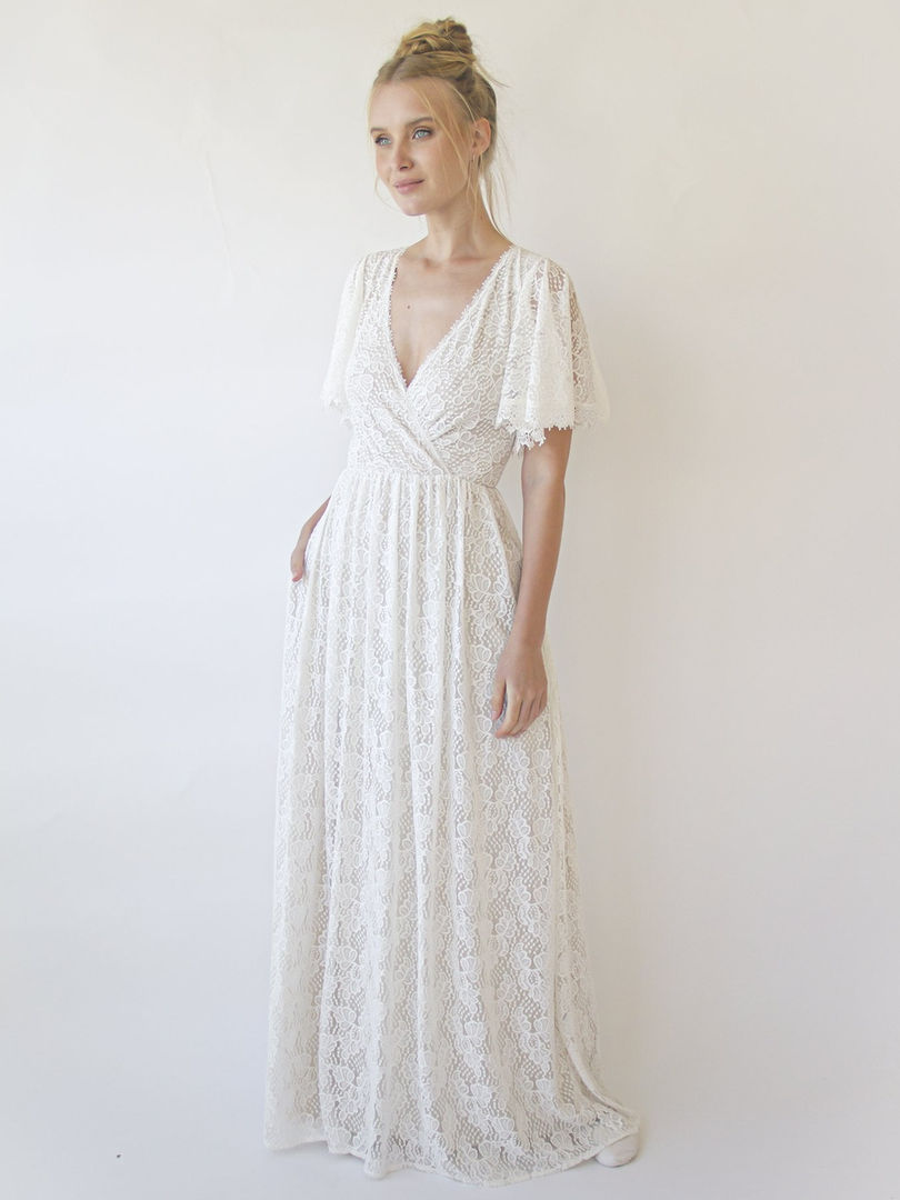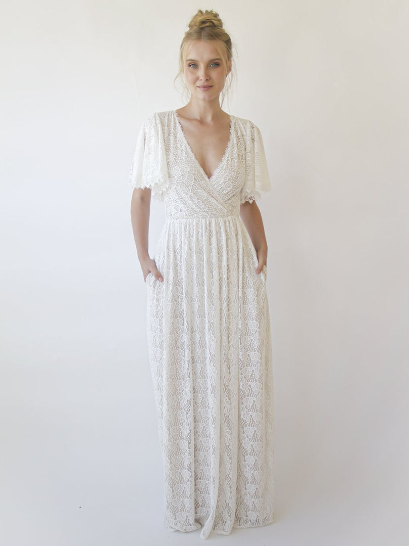 Ivory Pearl Lace Bohemian Wedding Dress With Pockets #1345