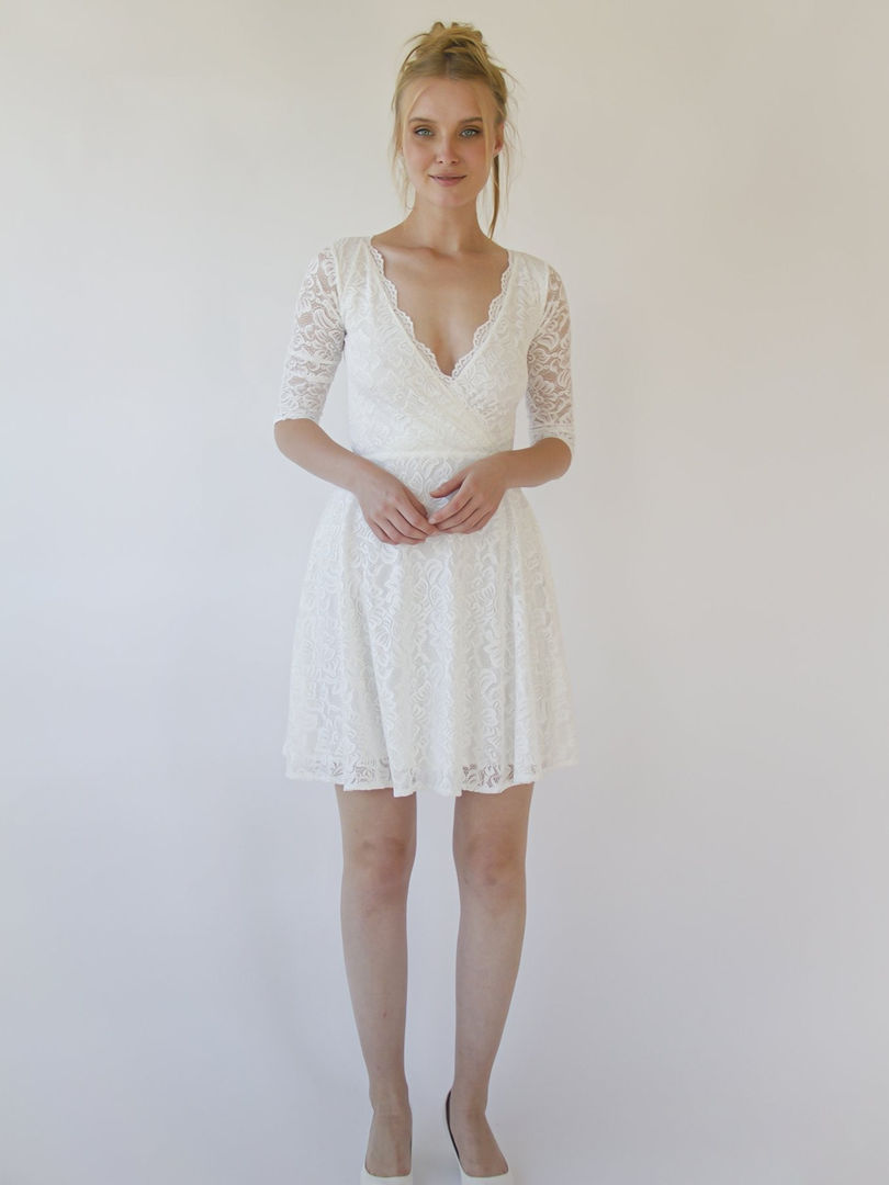 Short wedding dress with a lace bodice and three-quarter sleeves
