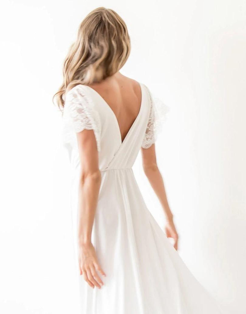 Ivory Wrap Wedding Dress With Short Lace Sleeves #1052