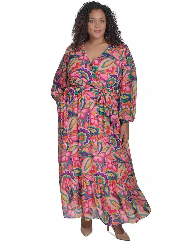 Plus Size Printed Tie-Waist Mini Dress Three Quarter Sleeve Polyester
