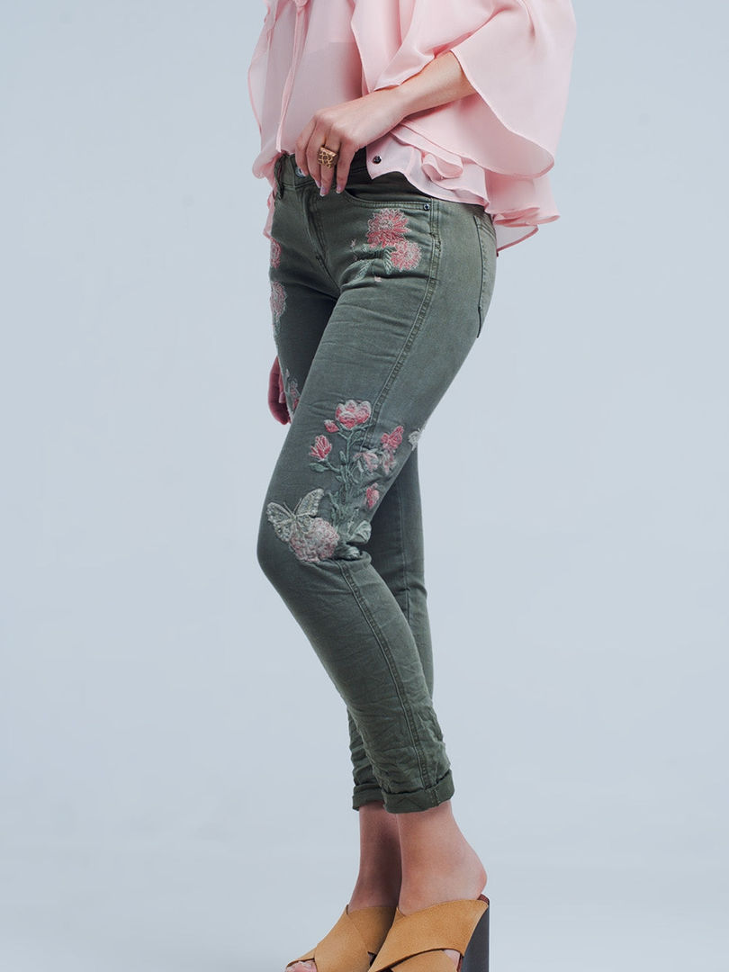 Khaki Jeans Skinny Fit Embroidered Flower Floral Print Casual Stretch Cotton