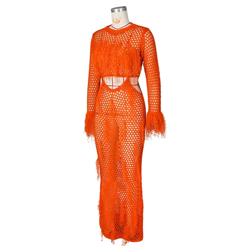 Knitted Long Sleeve Tassels Crochet Beach Cover Up Dress