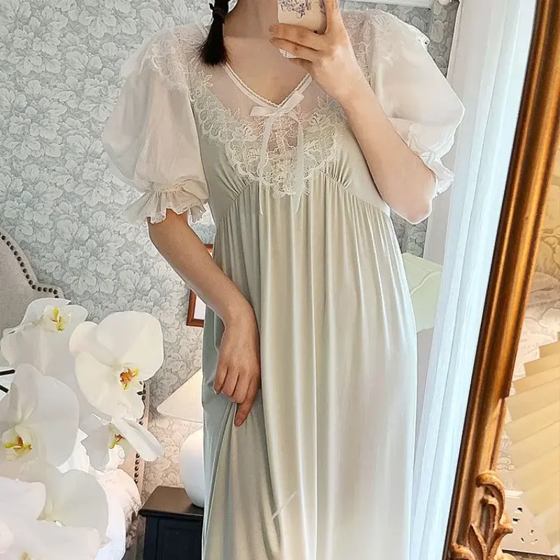 Lace Short Sleeve Nightgown - Casual Cotton Modal Sleepwear Dress