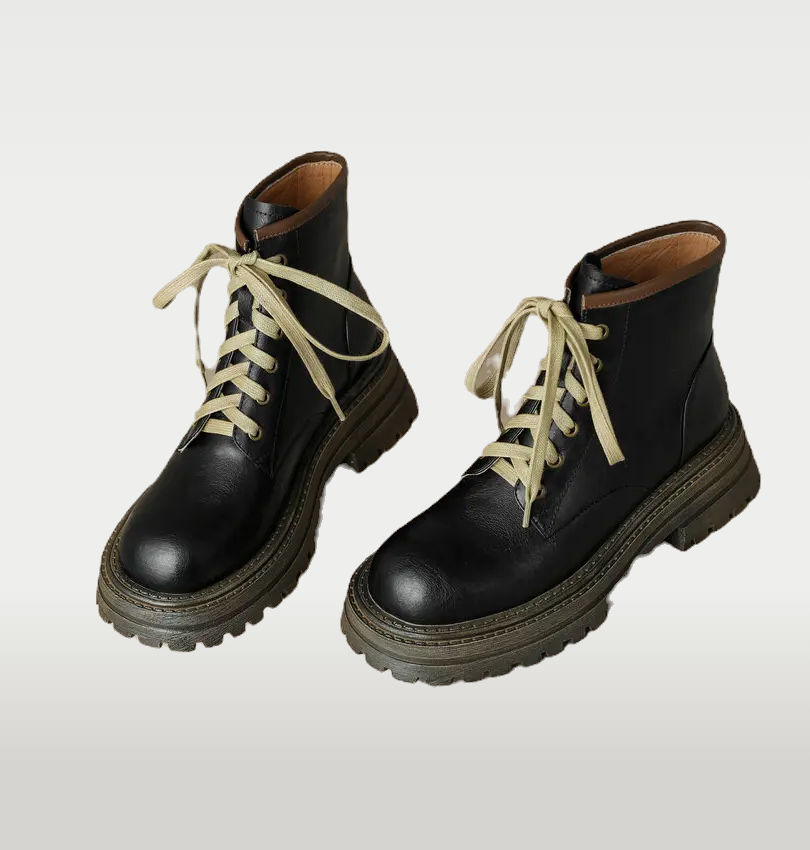 women's leather motorcycle boots, platform sole winter boots, lace-up combat boots for women, round toe ankle boots, genuine leather boots for cold weather, handmade leather footwear, pigskin lined winter boots, British style ankle boots, comfortable platform boots, stylish winter boots for women, durable leather boots, fashion motorcycle boots, everyday winter boots women, warm ankle boots with laces
