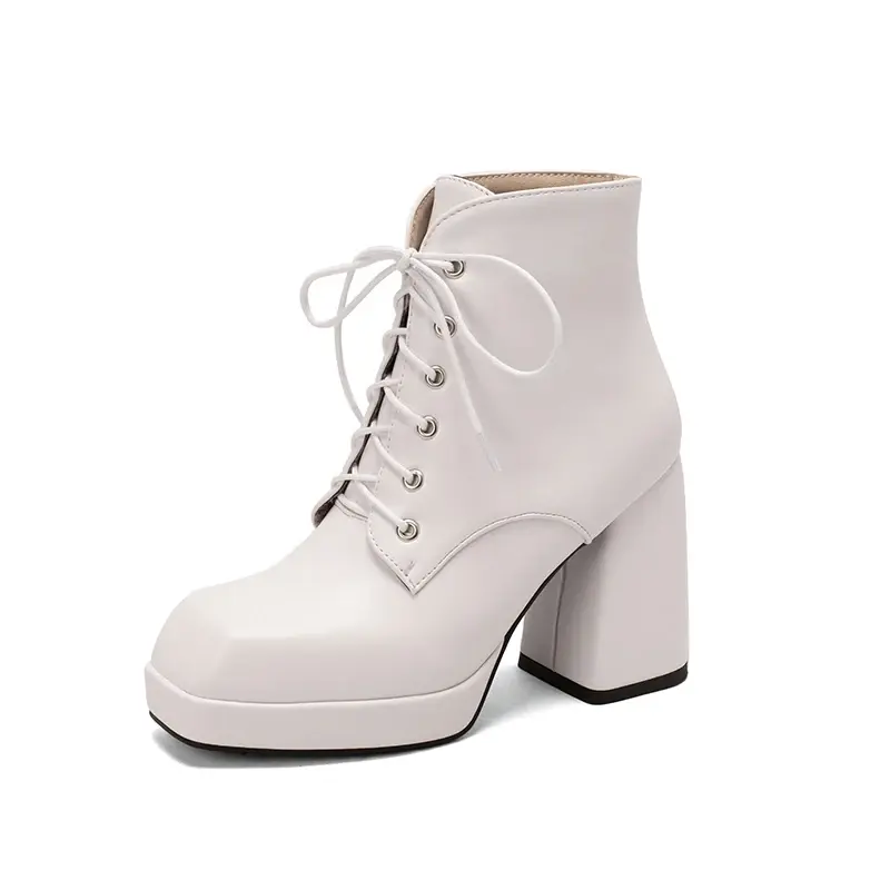 These modern ankle boots effortlessly combine fashion and function. Designed with a trendy platform sole and a super high square heel, these boots add a chic lift to any outfit. The lace-up closure ensures a secure and adjustable fit.