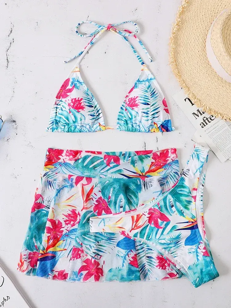 Leaf Print Halter Bikini Set Swimsuit Bathing Suit 3 Piece