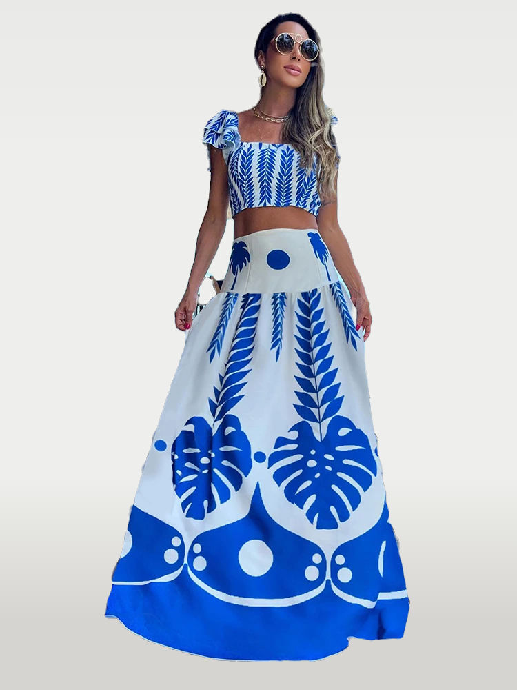 Leaf Print Ruffled Sleeve Beach Dress Two Piece Swimsuit
