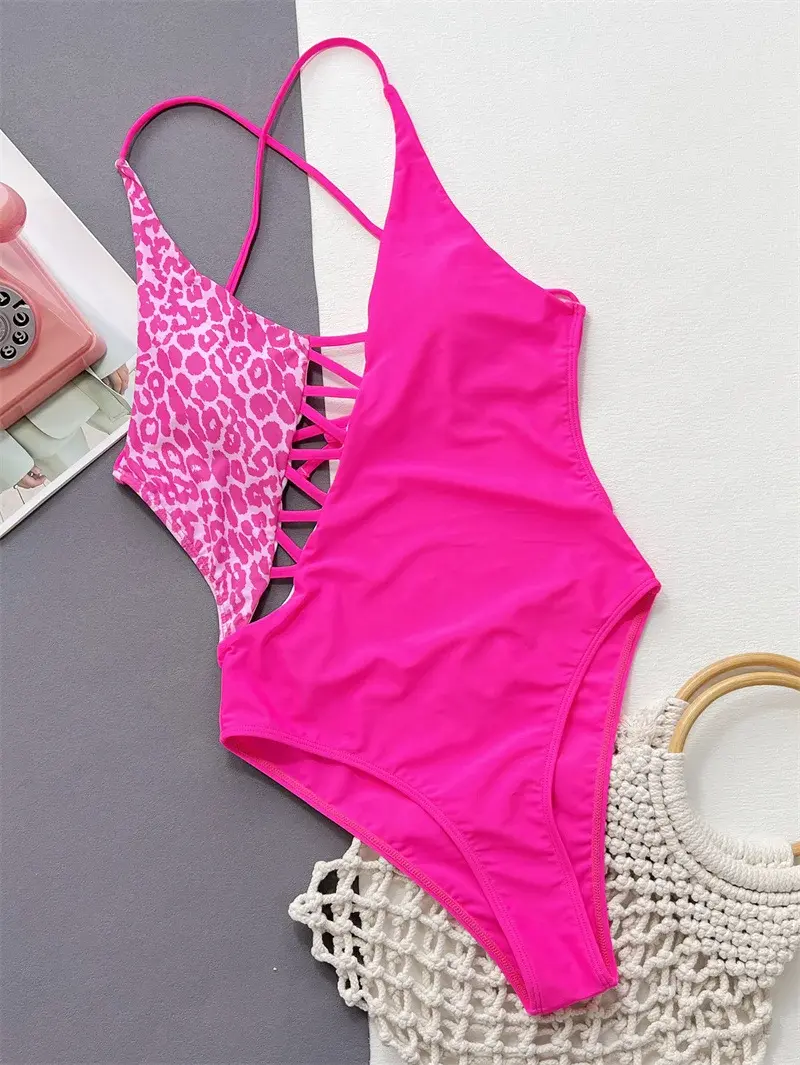 Leopard Print Patchwork One Piece Swimsuit Hollow Out Bathing Suit