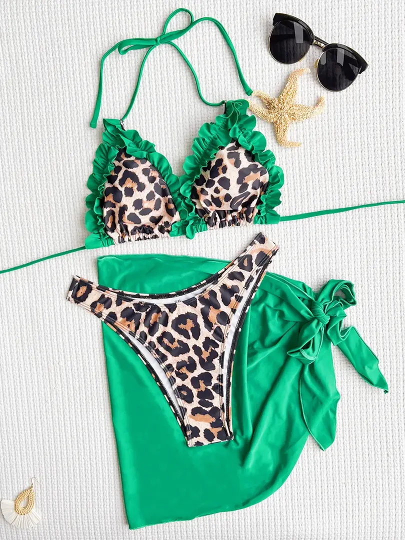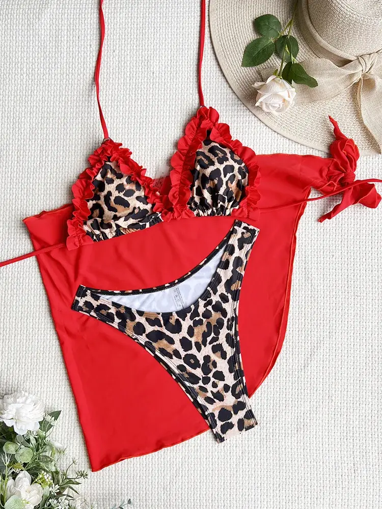Leopard Print Ruffled Bikini Swimsuit with Sarong - Beachwear