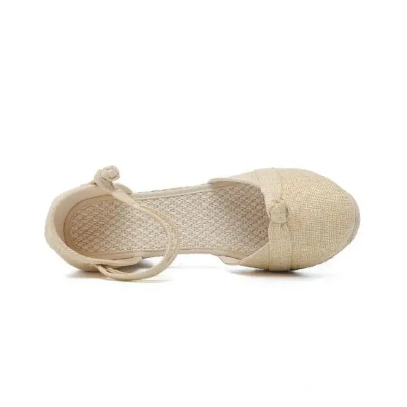 Linen Wedge Sandals Rome Style Ankle Strap Open Toe Platform Shoes