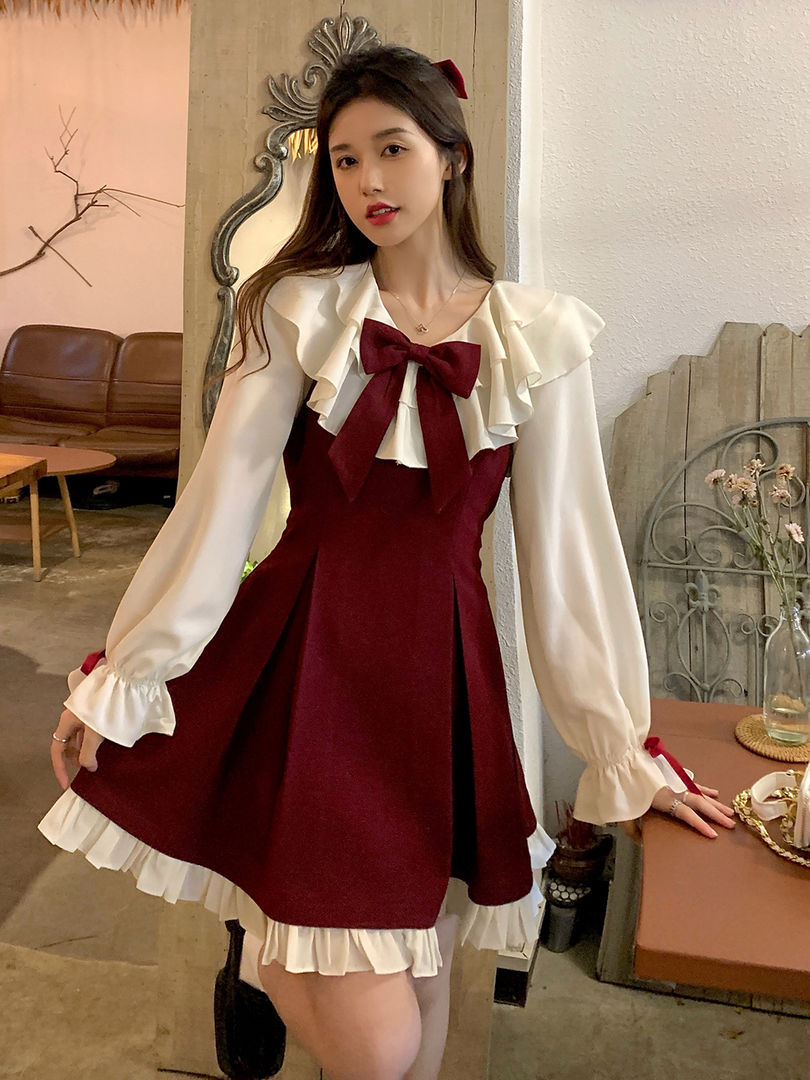 Tags: korean style long sleeve mini dress, women's a-line dress with bow detail, contrast color v-neck pullover dress, preppy style empire waist dress, casual autumn dress for young women, long sleeve ruffle trim mini dress, sweet style patchwork a-line dress, korean fashion daily wear dress, spring autumn long sleeve dress, cute v-neck dress with long sleeves, princess style ruffle mini dress, age reducing style dress for women, black and white contrast collar dress, casual empire waist a-line dress