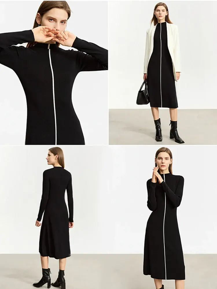 Embrace timeless elegance with this versatile A-line knitted dress. Crafted with a blend of soft and cozy materials, it boasts a flattering slim fit and a stylish half-high collar, perfect for transitioning from day to night with effortless chic. This mid-calf dress features a captivating patchwork pattern that adds a touch of sophistication to any occasion.