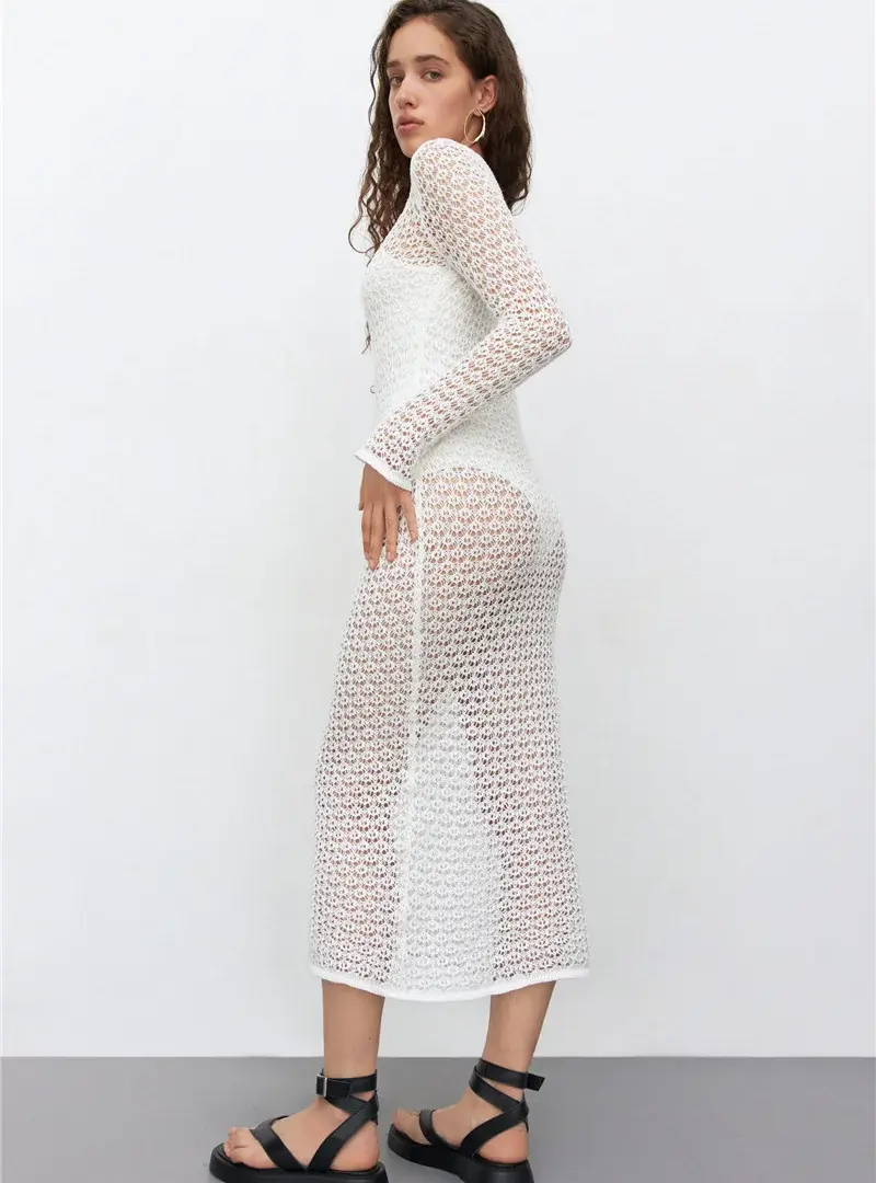 Long Sleeve Sheer Knit Beach Cover Up Dress Crochet Boho Casual