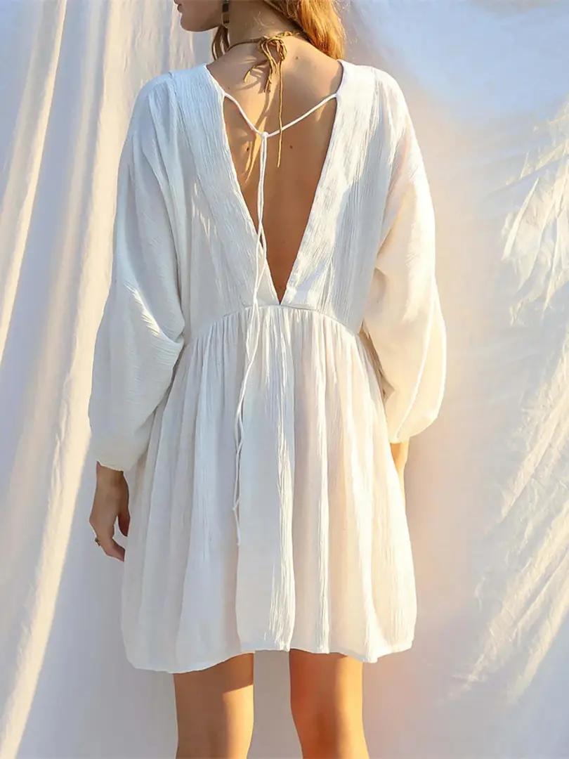 Long Sleeve V Neck Backless Cotton Tunic Beach Cover Up