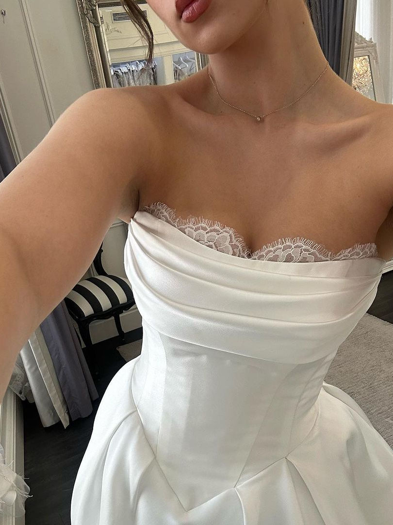 Tags:A-line wedding dress with lace, sweetheart neckline wedding dress, satin wedding dress with train, vintage style wedding dress, bohemian wedding dress long sleeves, plus size A-line wedding dress, lace up back wedding dress, floor length wedding dress for pregnant bride, affordable satin wedding dress, custom made wedding dress online, wedding dress with side slit, pleated wedding dress design, lustrous satin bridal gown, long sleeve wedding dress for outdoor wedding.