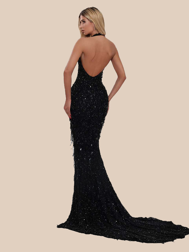 Black Floor-Length Halter Neck Evening Dress with Sequin Beading Tassel Sweep Tr