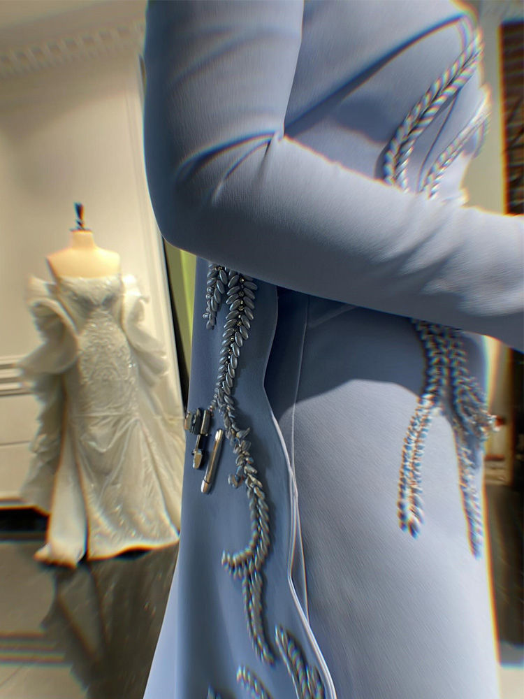 This floor-length evening dress is designed for your most formal occasions. It features an elegant off-the-shoulder neckline with full sleeves and delicate pearl embellishments. A built-in bra and Watteau train complete its sophisticated silhouette.