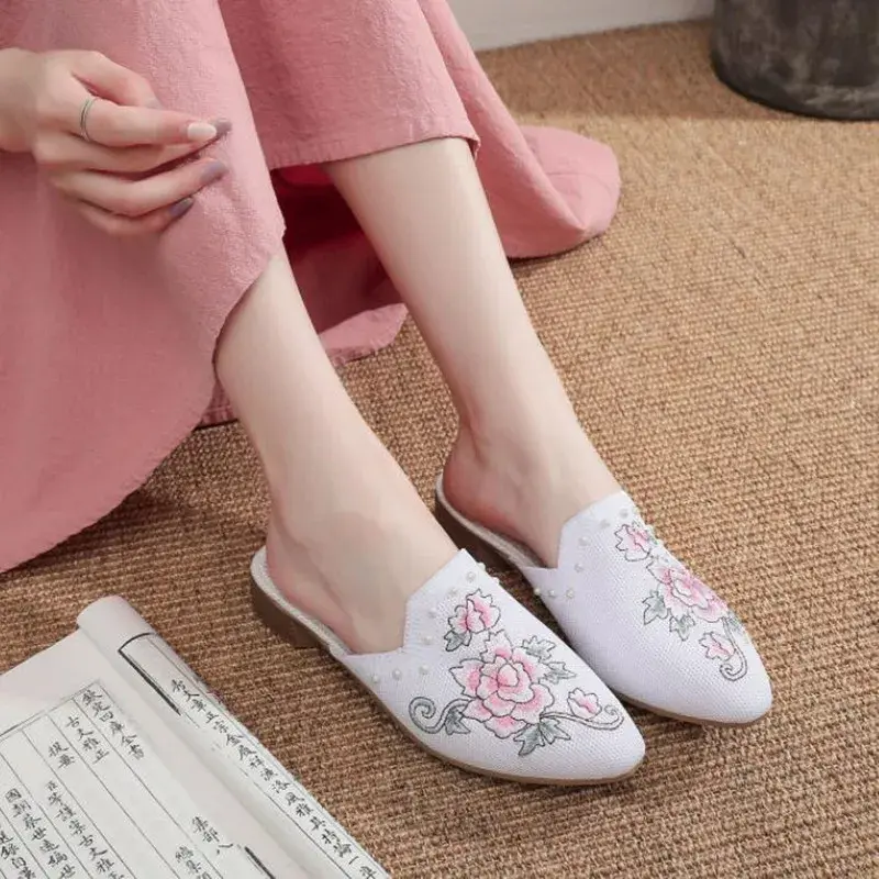 Mesh Embroidered Slippers Pointed Toe Retro Mules Outdoor Slide Sandals