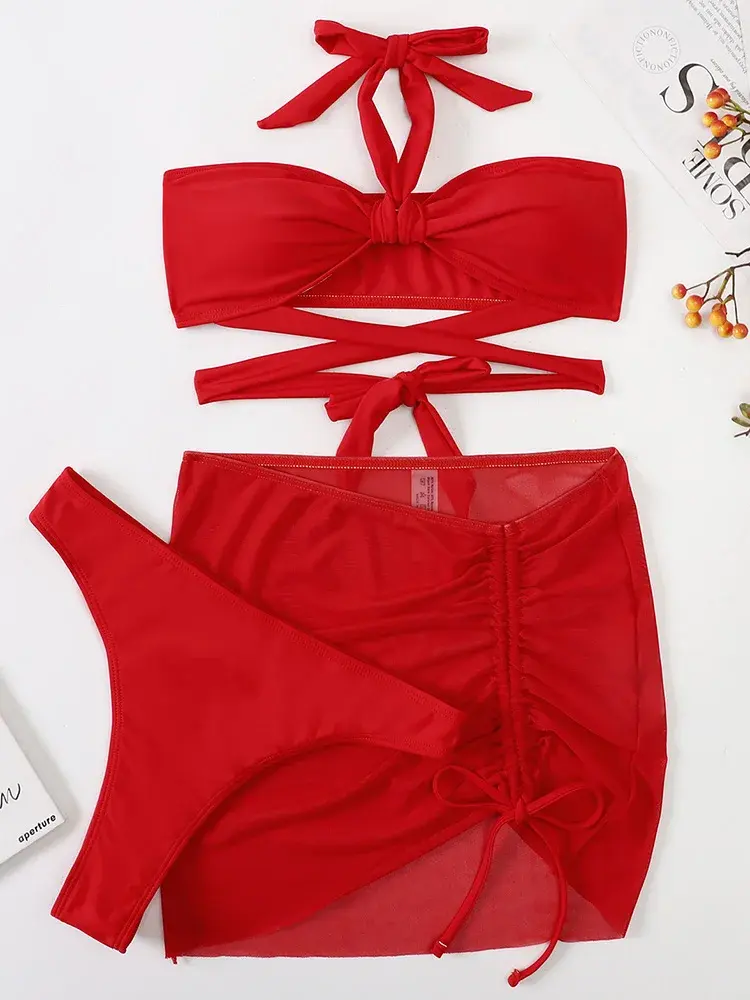 Mesh Halter Bikini Swimsuit Set, Three Piece Swimwear