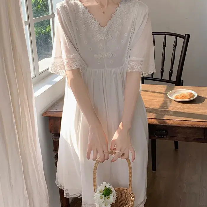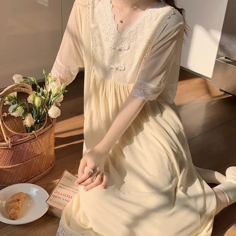 Tags: women's summer nightgown v-neck, comfortable lace trim sleepwear, breathable mid-calf nightdress, polyester viscose blend nightie, short sleeve elegant loungewear, soft solid pattern nightgown, ladies lightweight sleep dress, stylish home wear for women, comfortable night clothes for warm weather, elegant sleepwear for relaxing evenings, women's breathable night attire, chic and comfy nightgown, summer sleep solution for women, lace detail nightgown for her