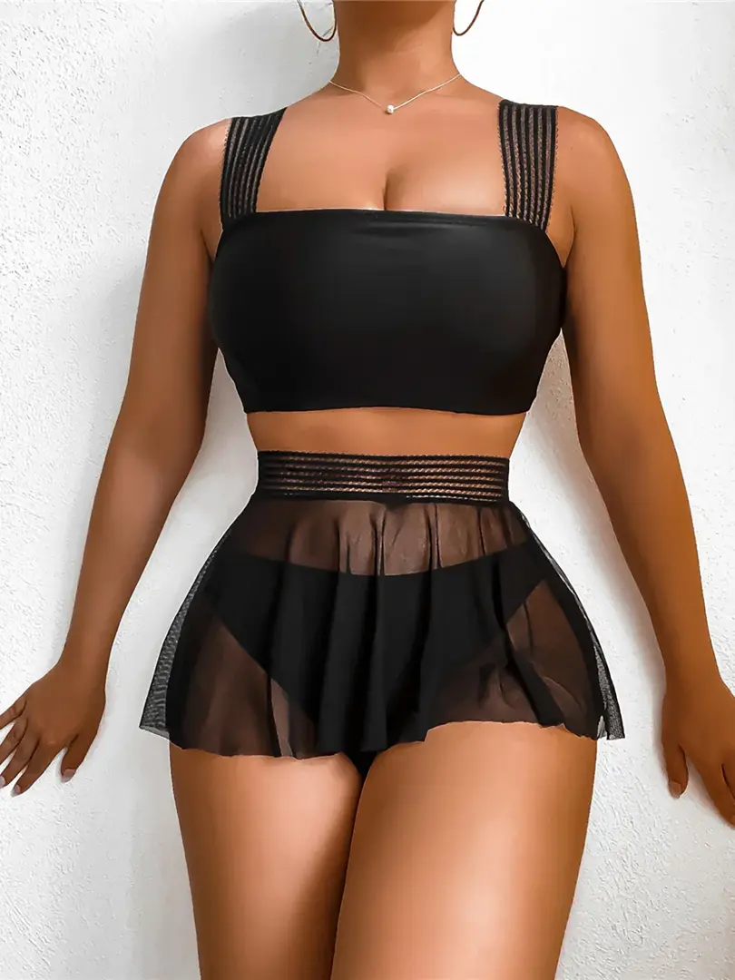 Mesh Sheer Skirt Bikini Swimsuit Three Piece Set