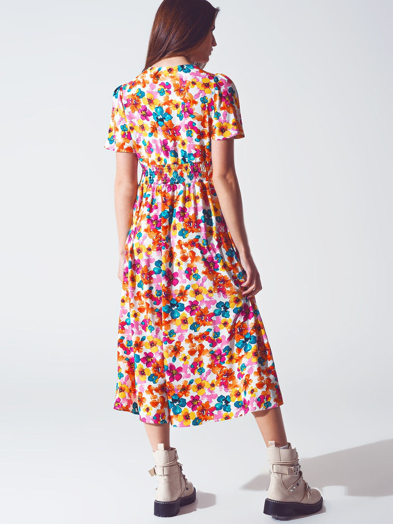 Midi Dress V-Neck Angel Sleeves Elasticated Waist Floral Print Satin Button Deta