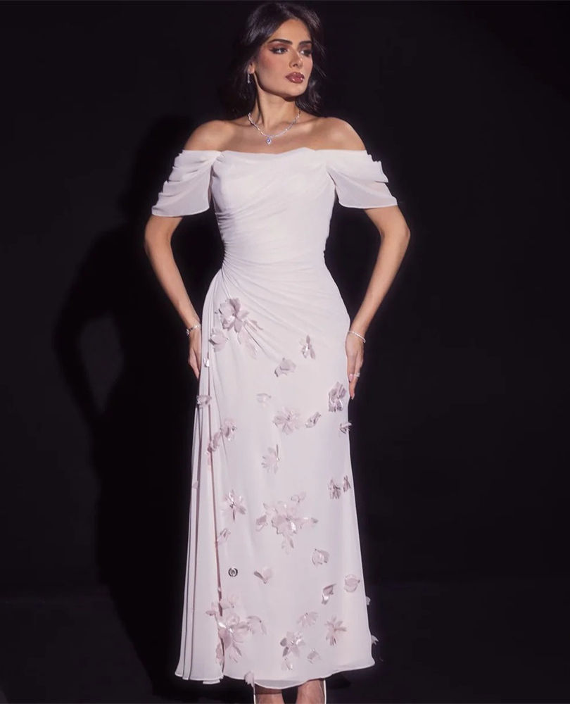 - A soft, swept-up hairstyle to show off the shoulder detail.